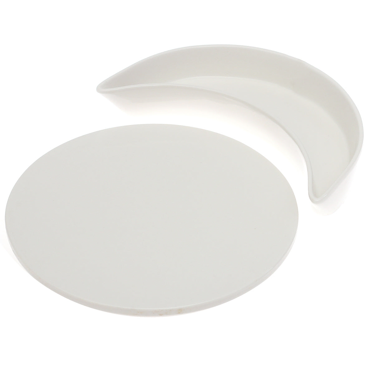 Create a striking table presentation with the Symphony Alfre Eclipse Serving Set, inspired by the elegant form of a lunar eclipse. This contemporary serving duo features a smooth round platter paired with a sleek crescent-shaped dish, both finished in a refined white ceramic glaze. Designed to complement each other beautifully, this set adds modern sophistication and artistic flair to everyday dining and special occasions alike.