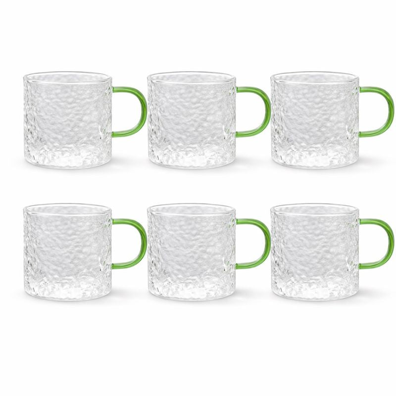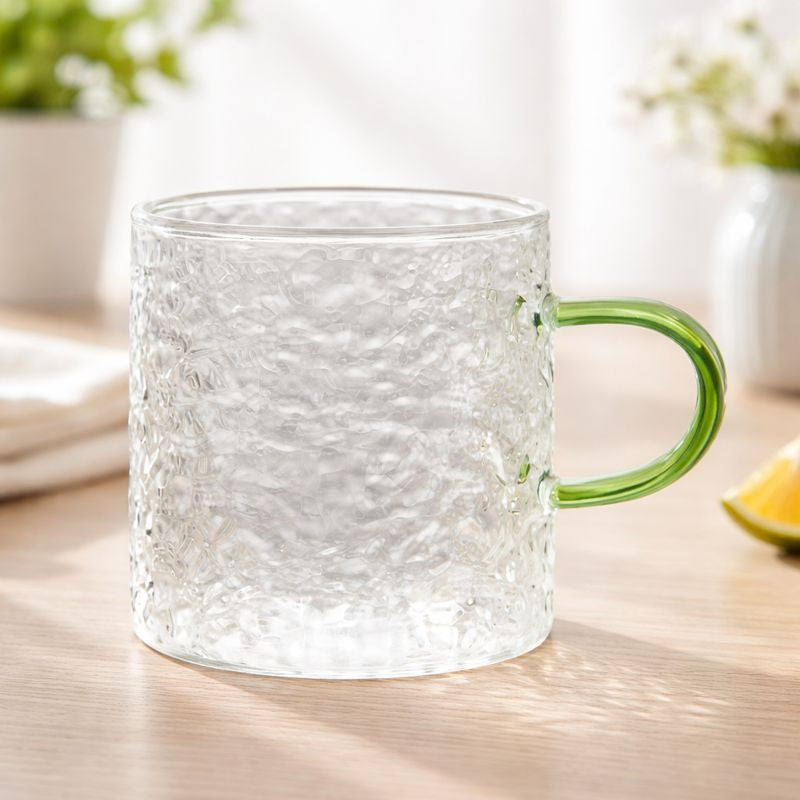 A luxurious textured glass mug set featuring a crystal-style finish and elegant handles. Perfect for serving tea, coffee, or hot beverages, these mugs add a premium and sophisticated touch to your table or coffee setup.