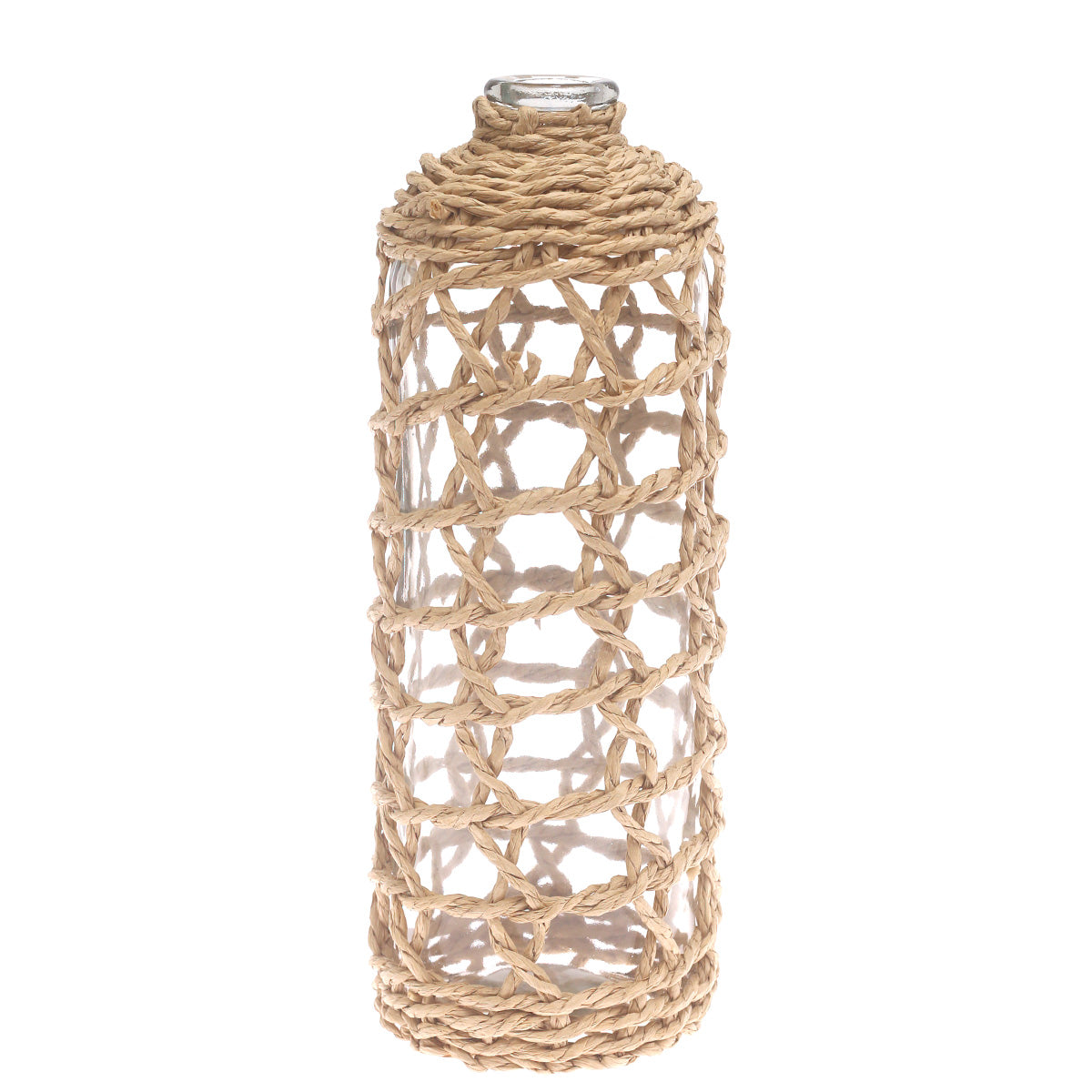 Add height and visual elegance to your décor with this Transparent Glass Vase featuring an intricate handwoven natural fiber wrap. The tall, slender silhouette beautifully showcases floral stems and decorative arrangements, while the open-weave natural fiber detailing adds warmth, texture, and an artisanal touch. Perfect for creating a statement on floors, consoles, or tabletops, this vase blends modern transparency with rustic charm for a timeless look.