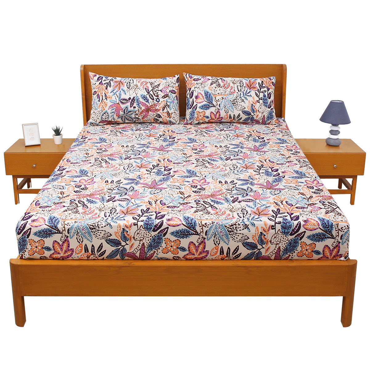 Transform your bedroom into a lively, cheerful retreat with this Colorful Floral Double Bed Sheet. Bursting with hues of orange, blue, purple, and pink, the intricate leaf and flower motifs on a soft white base create a striking yet balanced look. This playful design adds energy and freshness to any décor style — perfect for those who love color and creativity in their living space.