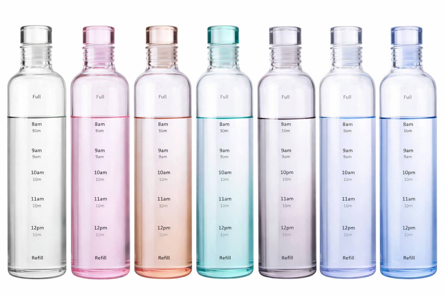 Color shades may vary slightly due to lighting and screen settings. Measurement and time markings are approximate and intended as hydration guidance only. Capacity refers to maximum fill level.