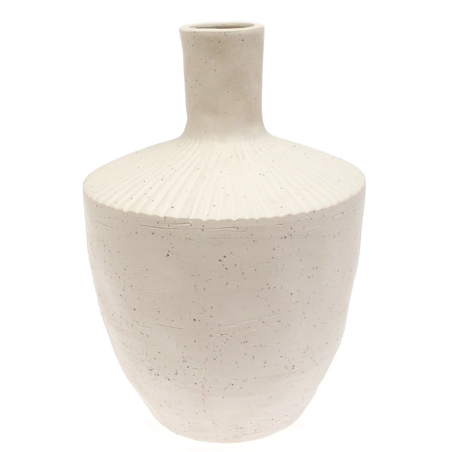 The matte white finish with delicate natural speckling adds warmth and texture, making it a perfect statement piece for consoles, side tables, shelves, or entryway décor. Whether displayed on its own or styled with dried florals, pampas grass, or long-stem greenery, this vase delivers a clean, serene, and curated aesthetic.